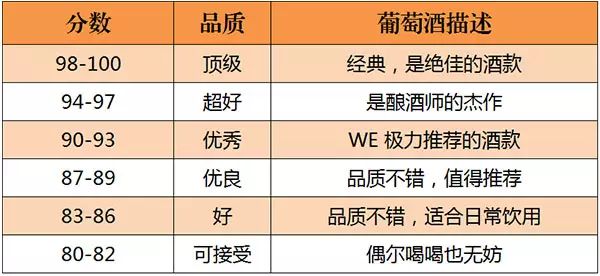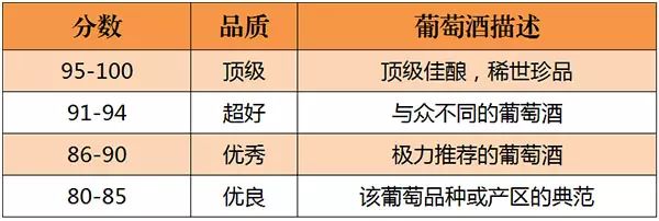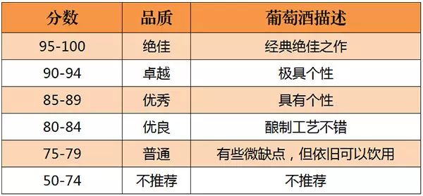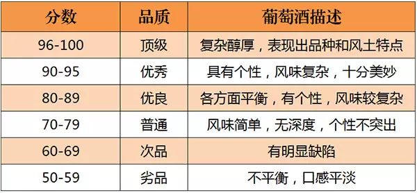 美國的《葡萄酒與烈酒》(Wine & Spirits)雜志是世界上最權威的葡萄酒雜志之一。自 1994年起,《葡萄酒與烈酒》也開始采取百分制對葡萄酒進行評分,葡萄酒首先會經過一些葡萄酒專業人士進行初次品嘗篩選,之后才會送到專業“評酒團”品評,所以該雜志評分的葡萄酒品質都不錯。評分標準如下所示: