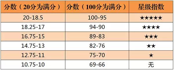 英國的《醇鑒》(Decanter,簡稱 DE)雜志始創于 1975 年,是一本專門介紹世界葡萄酒及烈酒的專業雜志。由于英國幾乎不生產葡萄酒,加上其王室在歐洲的崇高地位,大眾普遍認為英國對葡萄酒的評分會更客觀公正,因此《醇鑒》雜志在英語國家有著很大的影響力。該雜志評分采用 20 分制,0.25 分為最小單位,提供百分制換算,同時有從 0 星級到 5 星級的推薦規范: