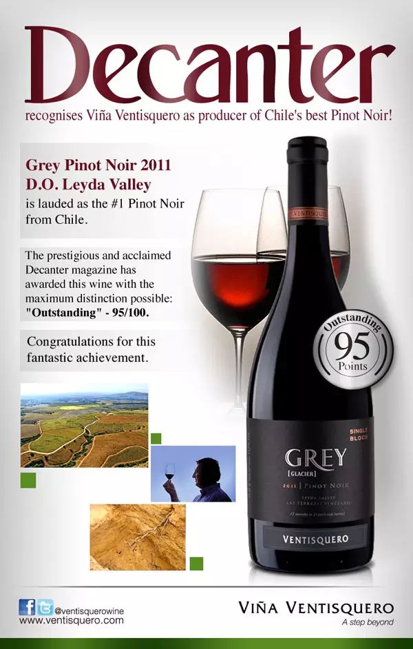 冰川酒莊格麗系列黑皮諾紅葡萄酒 2011 年份(Ventisquero Grey Pinot Noir)就獲過《醇鑒》的 95 分高分評價,星級指數 5 顆星。此款酒散發黑莓、草莓的香氣,酸度適宜,經橡木桶陳釀后單寧柔和,品質優異。