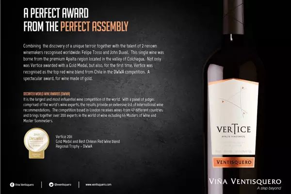 另外,該雜志還舉辦了極具影響力的醇鑒葡萄酒國際大獎賽(Decanter World Wine Awards,簡稱 DWWA)。該賽事始于 2004 年,一直是歐洲最杰出的葡萄酒競賽之一。同《醇鑒》評分體系一樣,該大賽也是采取 20 分滿分制,14.5 分以下沒有獎項,14.5-15.4 分為推薦獎,15.5-16.9 分為銅獎,17-18.4 分為銀獎,18.5 分以上是金獎。除此之外,大賽還設置了地區獎(Regioal Trophy)和國際獎(International Trophy)。如冰川酒莊神曲紅葡萄酒 2011 年份(Ventisquero Vertice Carmenere/ Syrah)就獲得了 DWWA 的地區金獎。