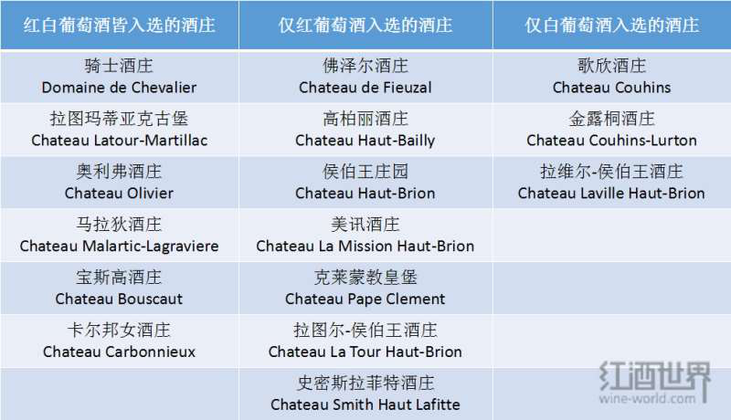 直到1953年,法國國家原產(chǎn)地命名管理局(Institut National des Appellations d'Origine,簡稱INAO)對格拉夫的紅葡萄酒進行評級,并擬定了一份非官方名單,共有13座酒莊入選。1959年,該分級制度在原來的基礎(chǔ)上新添了對格拉夫干白葡萄酒的評級。在最終公布的官方名單中,共有16座列級莊入選,其中紅、白葡萄酒均入選的有6座,僅紅葡萄酒入選的有7座,僅白葡萄酒入選的有3座。