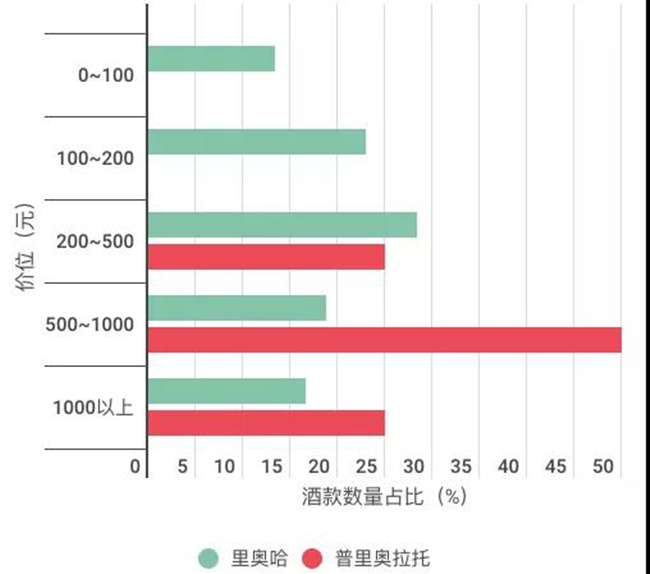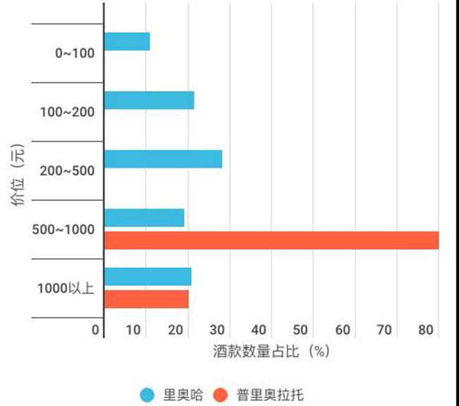 電商平臺普里奧拉托與里奧哈葡萄酒價位分布對比