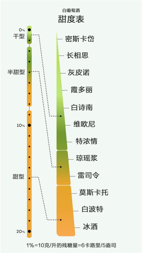 白葡萄酒中,密斯卡岱、長相思(達格諾酒莊絲萊克白)、灰皮諾、霞多麗(默爾索酒莊白)和白詩南葡萄酒通常被釀成干型的風格,維歐尼、特濃情(比薩諾酒莊家族白)和瓊瑤漿(圣雷米埃連維園老藤干白)葡萄酒通常被釀成近乎干型的風格,而雷司令葡萄酒、莫斯卡托葡萄酒、白波特和冰酒則通常被釀成甜型的風格。