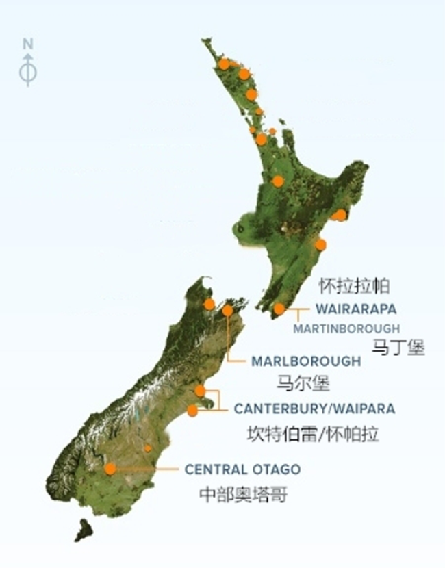 馬丁堡的面積較小,其位于北島(North Island)最南端的懷拉拉帕(Wairarapa)產區,與馬爾堡隔海相望。馬丁堡四周山脈和丘陵環繞,受海洋季風的影響較小,降水稀少,是北島最干燥的產區之一。同時,因夜間山頂的冷空氣會沿著山坡下沉,葡萄園的晝夜溫差較大,有助于葡萄緩慢地積累風味物質。產區的土壤主要由礫石與沖積土構成,土質貧瘠且排水性佳,有利于葡萄樹扎根深處并汲取更多復雜風味。