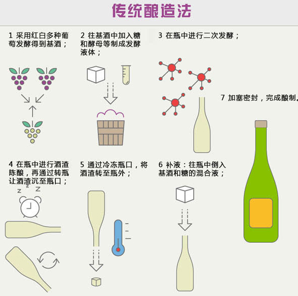 采用傳統(tǒng)釀造法釀制的起泡酒有很多,香檳就是其中之一。除此之外,還有香檳之外的其它法國起泡酒、西班牙的卡瓦以及意大利的弗朗齊亞柯達等。