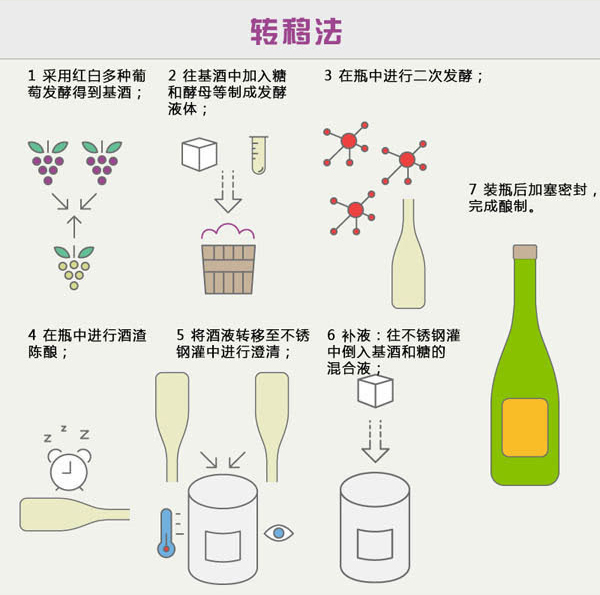 轉(zhuǎn)移法和傳統(tǒng)釀造法在初期階段極為相似,不過前者在瓶中發(fā)酵完成后,會轉(zhuǎn)移至不銹鋼灌中進行澄清,完成剩余步驟,然后再重新裝瓶。