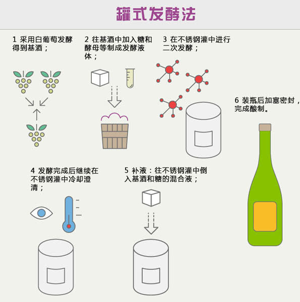 罐式發(fā)酵法最大的優(yōu)點就是成本低,耗時少,節(jié)省勞動力,目前世界上大多價格實惠的起泡酒都采用罐式發(fā)酵法釀制。這種起泡酒一般口感簡單,香氣明顯。不過,由于沒有進行酒渣陳釀,少了酵母帶來的復(fù)雜風(fēng)味,因此嘗起來就像靜止葡萄酒中加入了氣泡一樣