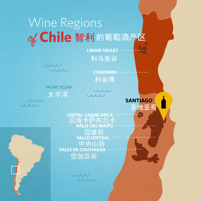 從首都圣地亞哥出發(fā),很快就能到達(dá)智利一些最為著名的葡萄產(chǎn)區(qū)。這些地區(qū)的葡萄種類繁多,既出產(chǎn)單一品種的葡萄酒,也出產(chǎn)混釀葡萄酒。在美國市場(chǎng)上,智利的葡萄酒一直都比較暢銷,其中空加瓜谷、中央山谷(Valle Central)和邁坡谷是智利銷量最大的三個(gè)產(chǎn)區(qū)。