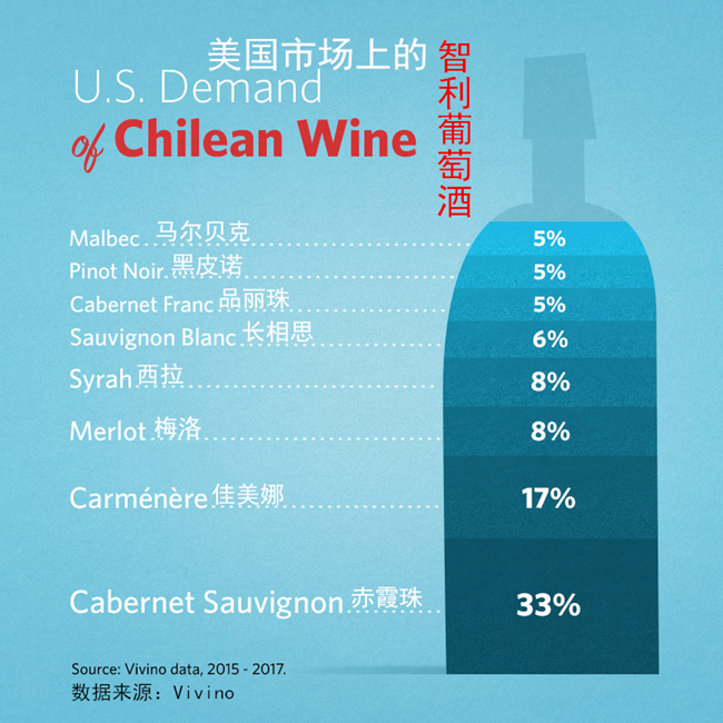 近年來,由于國際需求上漲,智利的葡萄酒行業(yè)發(fā)展勢(shì)頭迅猛。雖說現(xiàn)在智利標(biāo)志性的葡萄品種依然是佳美娜,但由于國際上對(duì)赤霞珠的需求日益旺盛,在出口到美國的葡萄酒中,采用佳美娜釀造的實(shí)際上只占了17%,而最近頗受歡迎的赤霞珠葡萄酒則占到了總出口量的近三分之一。此外,梅洛和西拉的市場(chǎng)份額占比都略高于8%。