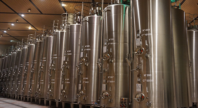 葡萄經過去梗和破碎之后,便會轉移至發酵罐中。發酵容器可以是不銹鋼罐、水泥罐或是橡木桶,且一般容量較大,頂部為敞口設計,便于釀酒師在發酵過程中對酒帽進行控制。酒帽指的是發酵過程中浮在酒液表面上的一層厚厚的果肉與果皮,如果不對酒帽進行控制,任由其自然發展,那么下層酒液與它的接觸就會比較有限,不利于充分萃取顏色、香味物質和單寧,因此發酵過程中,控制酒帽極為重要。