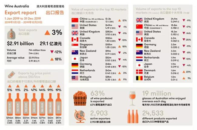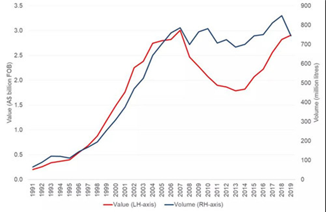 隨著市場(chǎng)對(duì)精品澳大利亞葡萄酒的需求日益增長(zhǎng),截至2019年12月底的12個(gè)月中,澳大利亞葡萄酒的出口總額增長(zhǎng)了3%至29.1億澳元。