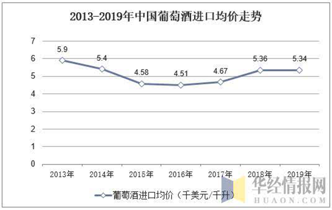 從進(jìn)口均價(jià)來(lái)看,近年來(lái)我國(guó)葡萄酒進(jìn)口均價(jià)基本維持在5千美元/千升,2015年葡萄酒進(jìn)口均價(jià)下降至5千美元/千升以下,2016年以后葡萄酒進(jìn)口價(jià)格又逐漸開(kāi)始回升,據(jù)海關(guān)統(tǒng)計(jì)數(shù)據(jù)顯示,2019年國(guó)內(nèi)葡萄酒進(jìn)口均價(jià)為5.34千美元/千升,與2018年基本持平。