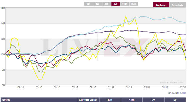 不論短期和長(zhǎng)期(5年),行業(yè)基準(zhǔn)的Liv-ex 100指數(shù)和最廣泛市場(chǎng)指標(biāo)的Liv-ex 1000指數(shù)的表現(xiàn)均優(yōu)于全球股票(和石油!)。 在過(guò)去五年,Liv-ex 1000指數(shù)已上升了40%,而FTSE100指數(shù)卻下跌了5%。