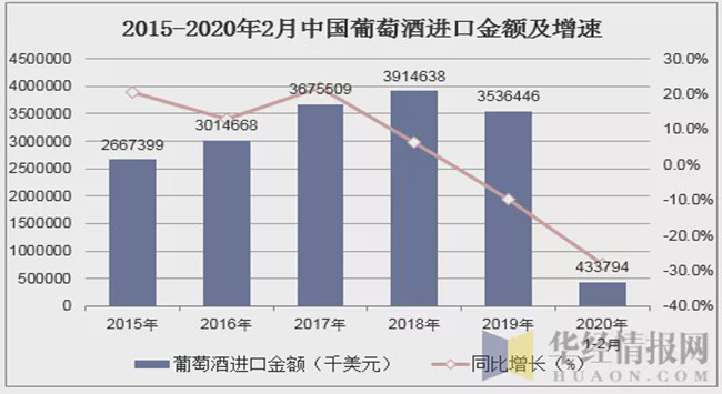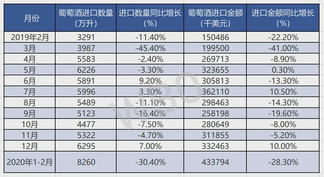 • 2020年1-2月葡萄酒進口量同比下跌30.4%