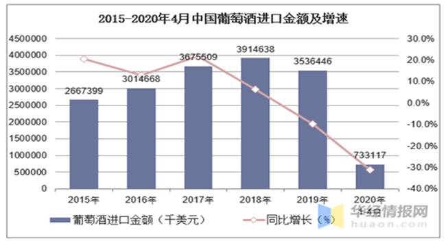 2015-2020年4月中國葡萄酒進口金額及增速