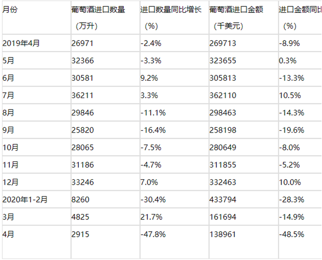 • 2020年1-4月進口葡萄酒量價再跌,4月同比下降47.8%!