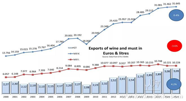 散酒貿易總量趨于平緩,而總價方面的上升也開始出現了疲軟的這個勢頭。大家越來越希望拿到高質量的葡萄酒。作為散酒出口大國,散酒貿易收縮的局面對于西班牙的出口是個威脅。