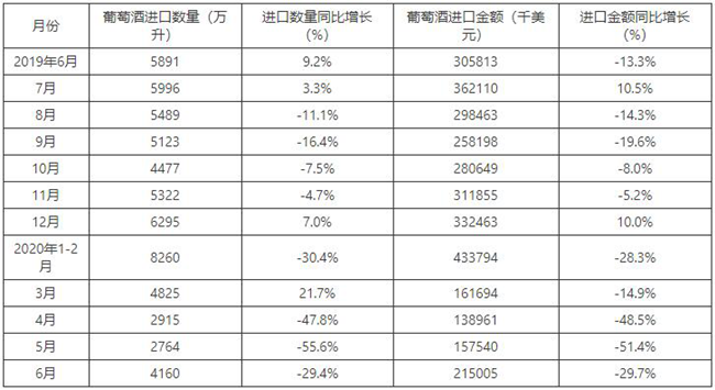 2020年6月中國葡萄酒進口數量為4160萬升,同比下降29.4%;進口金額為215005千美元,同比下降29.7%。