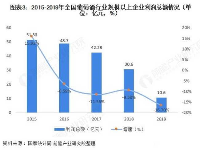 在營業(yè)收入與利潤總額方面,全國葡萄酒行業(yè)規(guī)模以上企業(yè)已經(jīng)連續(xù)三年“雙降”。2019年全國葡萄酒行業(yè)規(guī)模以上企業(yè)實現(xiàn)營業(yè)收入145.2億元,同比下滑17.5%;實現(xiàn)利潤總額10.6億元,同比下滑16.7%。