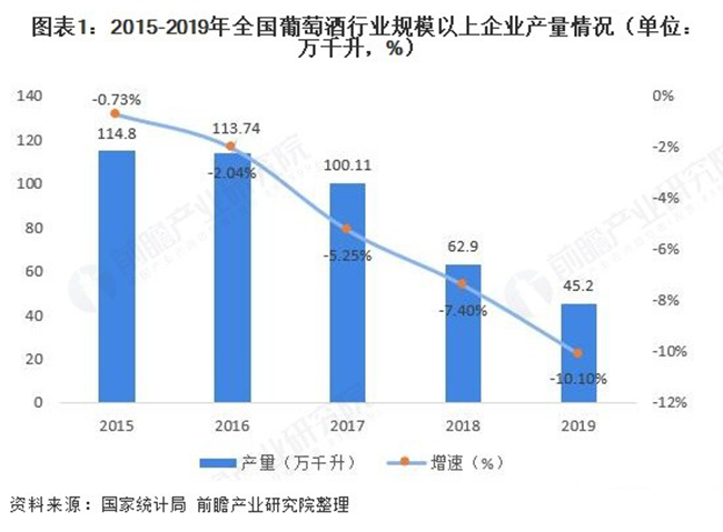 我國葡萄酒在經(jīng)歷了高速發(fā)展后自2013年進(jìn)入結(jié)構(gòu)性調(diào)整期,近年來行業(yè)產(chǎn)量、營業(yè)收入和利潤總額均呈現(xiàn)不同程度的下滑。在產(chǎn)量方面,為尋求供需平衡,行業(yè)持續(xù)降產(chǎn),2019年全國葡萄酒行業(yè)規(guī)模以上企業(yè)實現(xiàn)葡萄酒產(chǎn)量45.2萬千升,同比下滑10.1%。