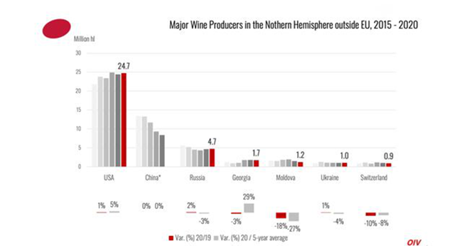 在歐盟以外的北半球,俄羅斯(4.7 mhl, +2%/2019)和烏克蘭(1.0 mhl, +1%/2019)等國家的2020年葡萄酒產量較高,而格魯吉亞和摩爾多瓦(經歷干旱)的產量分別下降了1.7 mhl(-3%/2019)和1.2 mhl(-18%/2019)。