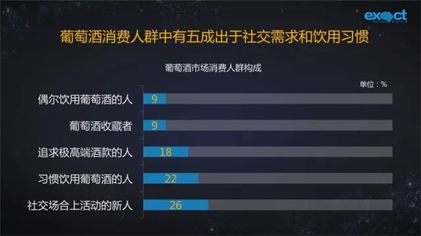 消費(fèi)者人群的構(gòu)成當(dāng)中,剛開始在社交場合上活動的新人,和正逐漸形成葡萄酒飲用習(xí)慣的人群幾乎占據(jù)了整個人群的半壁江山。