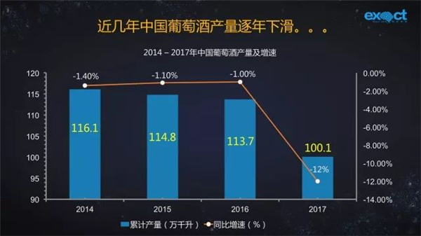 從統(tǒng)計數(shù)據(jù)看,2014-2017年,中國葡萄酒產(chǎn)量呈逐年下滑態(tài)勢。2017年中國葡萄酒產(chǎn)量為100.1萬千升,同比下滑12%。據(jù)業(yè)內(nèi)人士認(rèn)為,中國葡萄酒正處于調(diào)整優(yōu)化期,劣質(zhì)產(chǎn)能下滑,優(yōu)質(zhì)產(chǎn)能上升。一方面,進(jìn)口品牌對中國葡萄酒產(chǎn)業(yè)造成巨大沖擊;另一方面,低端低價競爭把國產(chǎn)葡萄酒逼入死胡同。