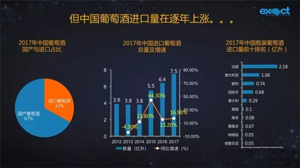 據(jù)統(tǒng)計數(shù)據(jù)顯示,2017年,中國消費(fèi)的葡萄酒中約1/3來自于進(jìn)口,進(jìn)口總量為7.5億升,同比增長16.9%。其中七成多為瓶裝葡萄酒。從進(jìn)口來源國來看,中國進(jìn)口葡萄酒主要來自于法國、澳大利亞、智利、西班牙。