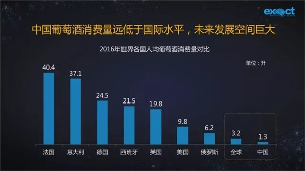 2016年,中國人均葡萄酒消費(fèi)量僅為1.3升,與法國、意大利、德國有很大差距,也低于全球平均水平。中國葡萄酒消費(fèi)還有很大的發(fā)展空間。