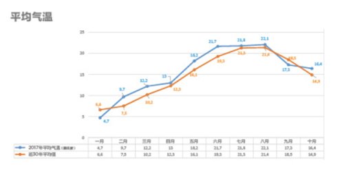 五月 溫暖、晴朗。降雨量缺稀20%。5月10日至17日,22日至31日,平均氣溫皆高于正常值。該月多出45小時(shí)日照時(shí)間。