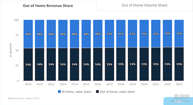 據(jù)統(tǒng)計(jì),目前全球在家庭中日常消費(fèi)的葡萄酒數(shù)量占葡萄酒總消費(fèi)量的71%,而消費(fèi)金額僅占全球葡萄酒總銷售額的45%。這也說(shuō)明,餐廳、酒吧、體驗(yàn)式門店(Enoteca)等渠道中對(duì)于葡萄酒銷售而言意味著更大的利潤(rùn)空間。