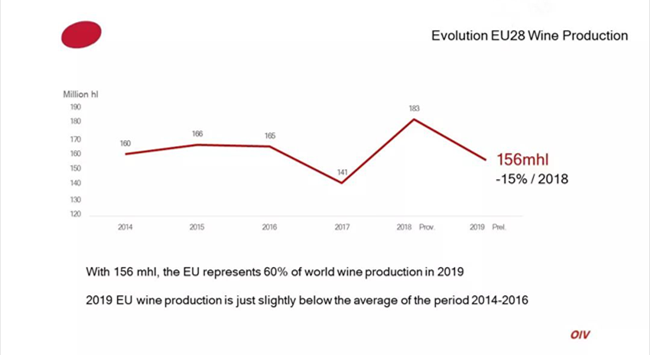 歐盟國家2019年葡萄酒產量156億升(mhl),占據全球葡萄酒產量的60%,略低于2014-2016年平均水平。