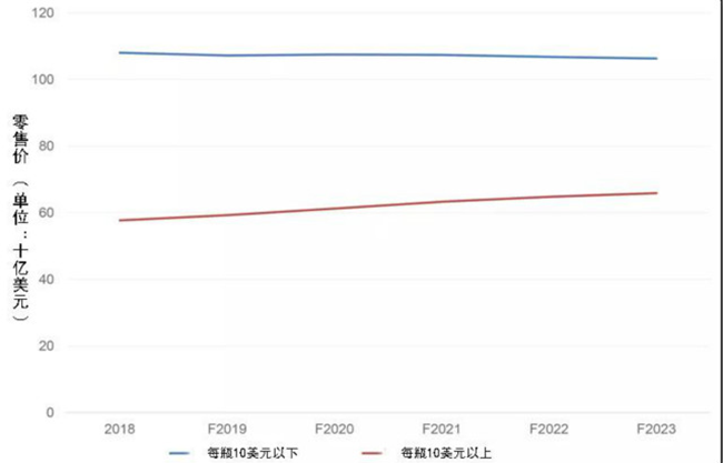 如果這些預(yù)測(cè)成真,這將意味著每瓶10美元以下葡萄酒的銷量份額將從87%降至85%,銷售額份額將從65%降至62%。