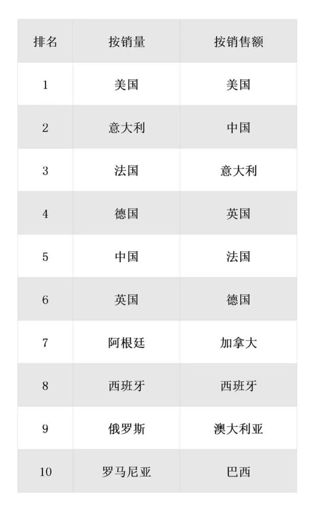 按銷售額計(jì)算,排名有更多的變動(dòng)。意大利從第5位上升到第3位,英國(guó)從第3位下降到第4位,法國(guó)從第4位下降到第5位。西班牙和澳大利亞分列第8和第9位,巴西取代日本,躍居第10位。