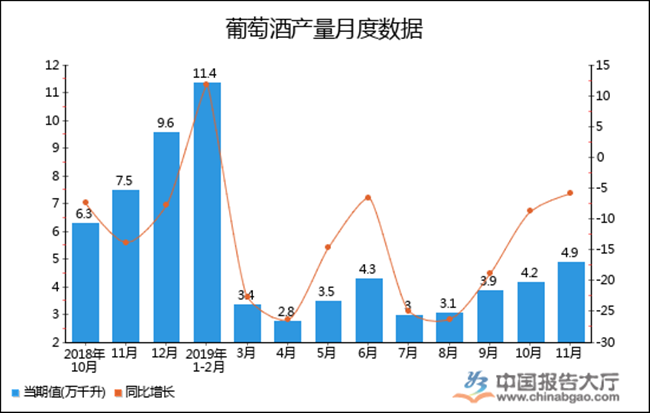 以上就是2019年1-11月全國(guó)葡萄酒產(chǎn)量統(tǒng)計(jì),數(shù)據(jù)來(lái)源于國(guó)家統(tǒng)計(jì)局及中國(guó)報(bào)告大廳數(shù)據(jù)中心整理發(fā)布,僅供參考。